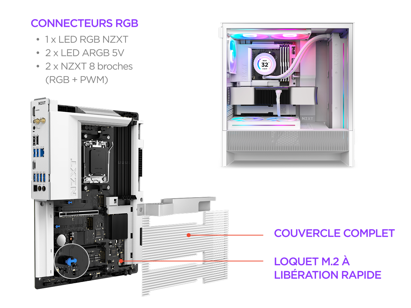 Le N7 B850 allie performance gaming avancée et design épuré et raffiné. Conçu pour les processeurs AMD® Ryzen™, il offre une alimentation robuste, une gestion thermique optimisée et une connectivité rapide avec DDR5 et PCIe 5.0. Une couverture complète du PCB améliore l’esthétique, créant une base propre et moderne pour toute configuration.