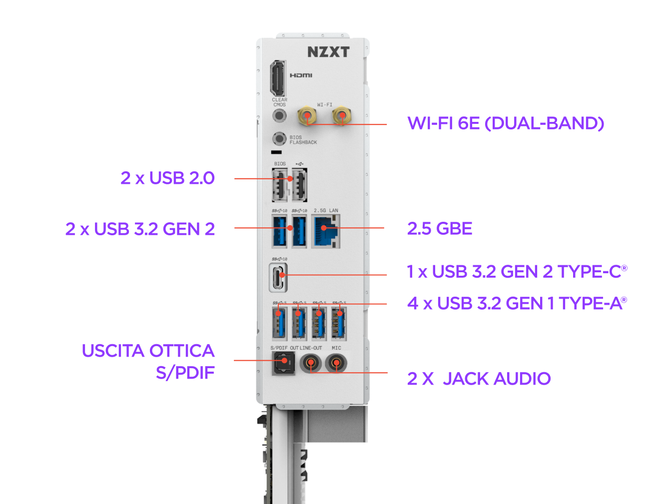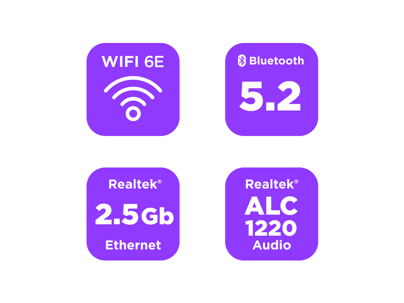 - Connettività veloce: USB 4 (40 Gbps), Wi-Fi 6E e 2,5GbE consentono trasferimenti dati rapidi e networking a bassa latenza.