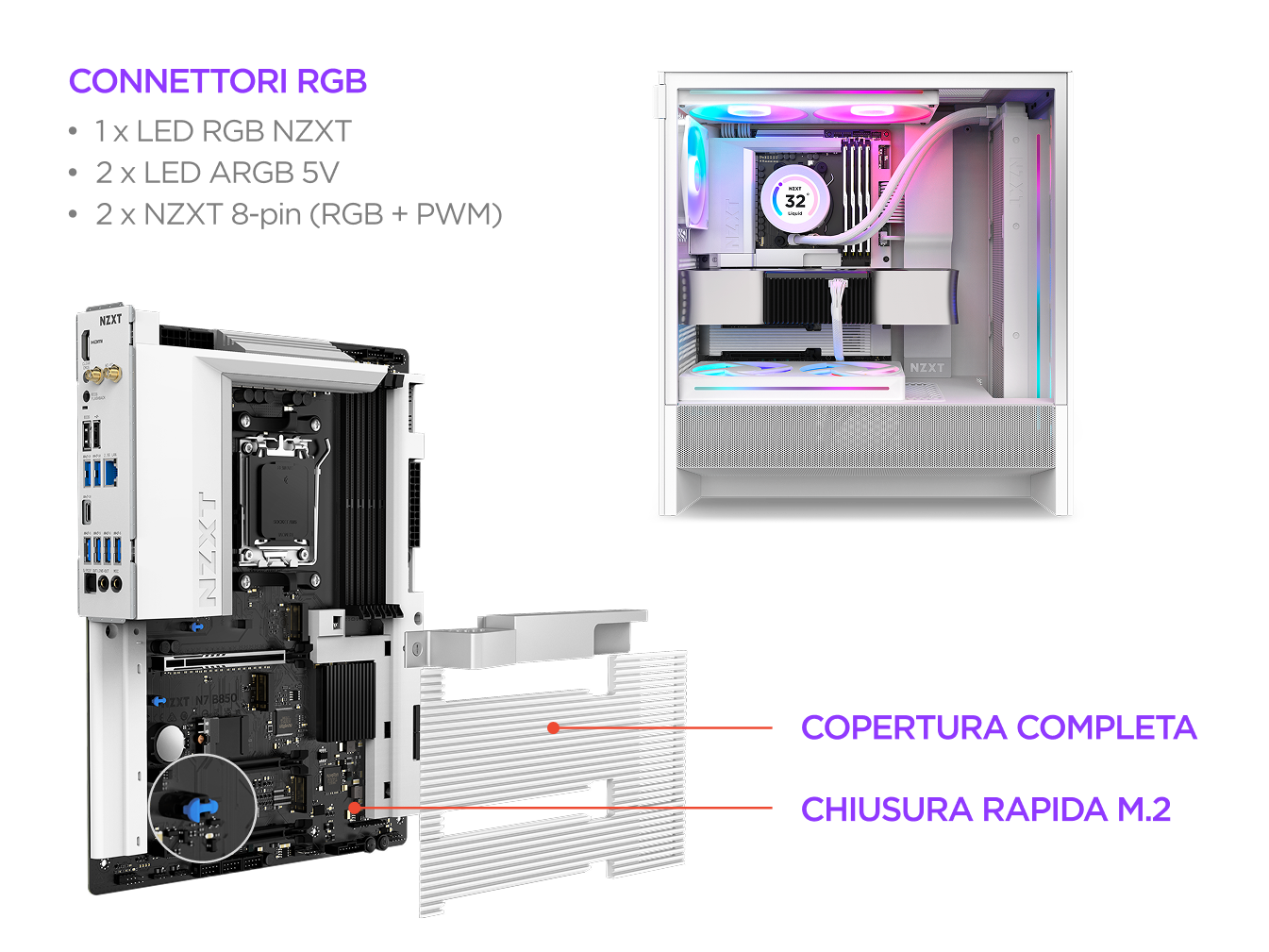 - Archiviazione ad alta velocità: Tre slot M.2, incluso uno PCIe® 5.0 con chiusura rapida e due PCIe® 4.0, offrono velocità ultra rapide e tempi di caricamento ridotti.